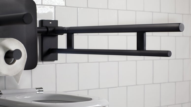 Als es darum ging, die Bäder hochwertig auszustatten, fiel die Wahl von Sroka auf HEWI. Hohen Wert legte man auf Aussehen, Haptik und Qualität der Produkte. Sie sollten über eine erstklassige Haltbarkeit und die richtige Oberfläche verfügen. Denn schwarze Bau- und Designelemente ziehen sich wie ein roter Faden durch die Gestaltung des Hotels. Harmonisch integrieren sich die HEWI Lösungen von System 900 daher in die Hotelbäder und barrierefreien Sanitärräume.