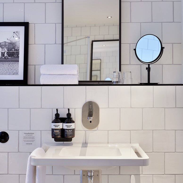 Black building and design elements run like a red thread through the design of the hotel. HEWI System 900 solutions integrate harmoniously into hotel bathrooms and accessible sanitary rooms.