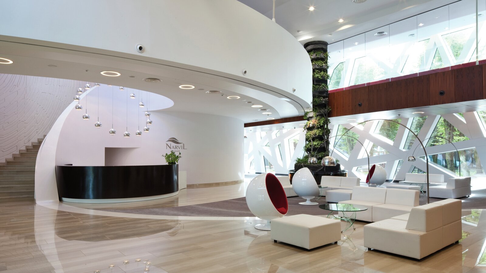 Hidden in the Serock forest and on the banks of the Narew River is the Narvil Hotel. It blends in harmoniously with the surroundings. Generous glass fronts allow a view of the omnipresent nature and create a flowing transition between inside and outside.