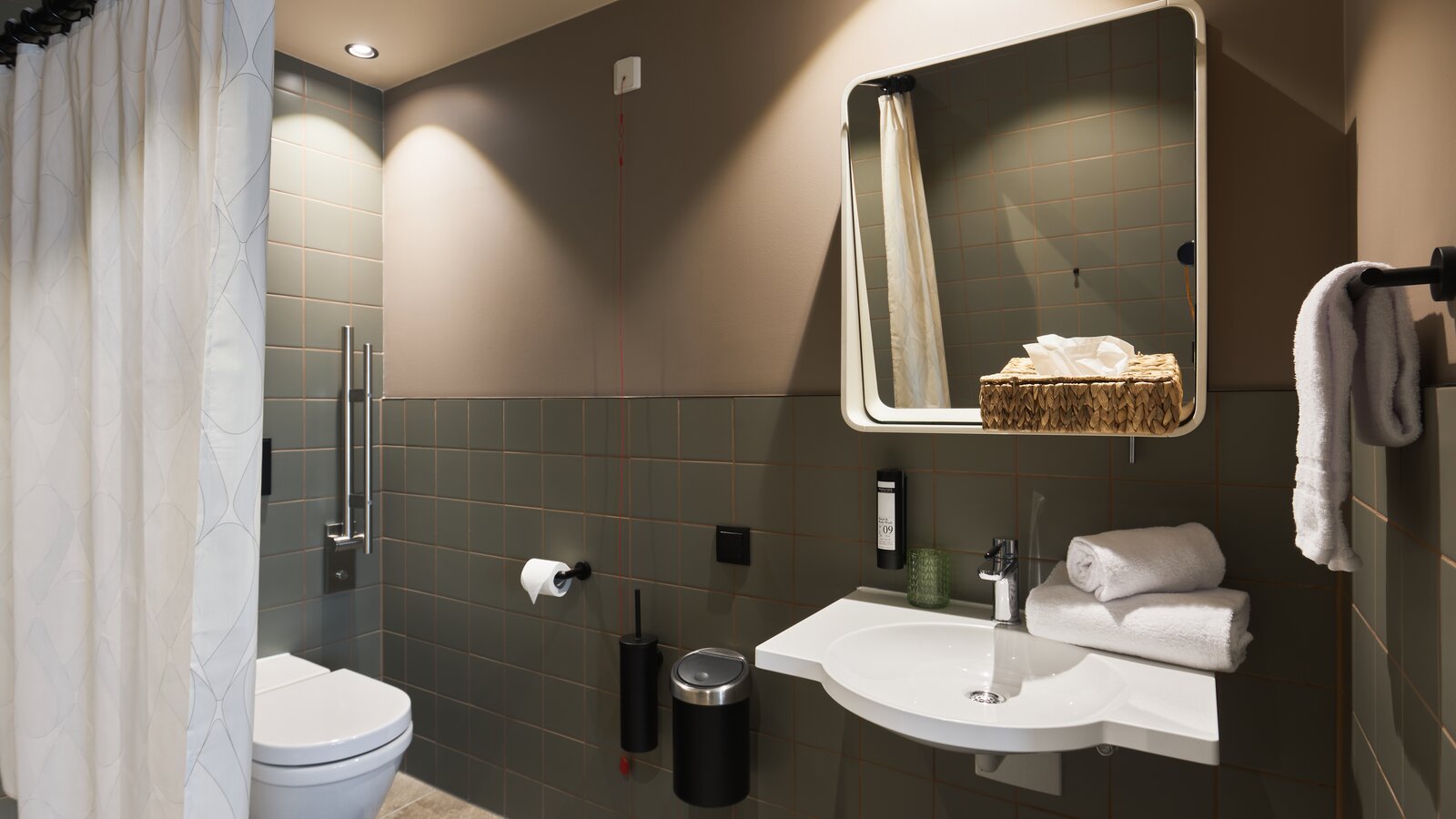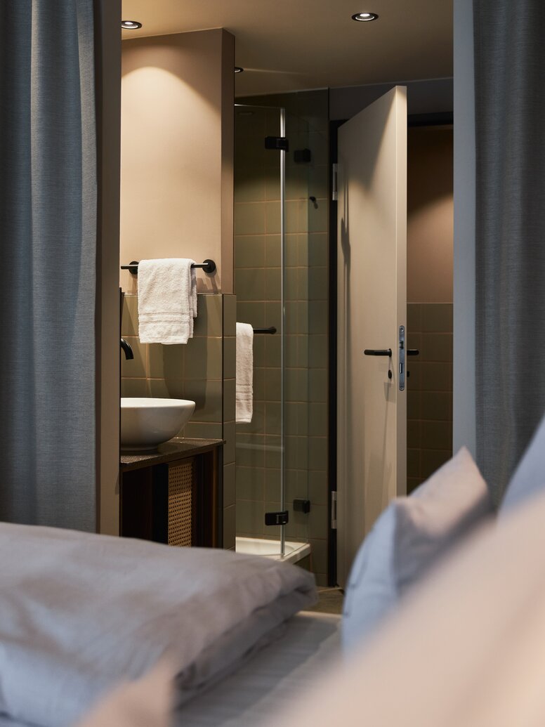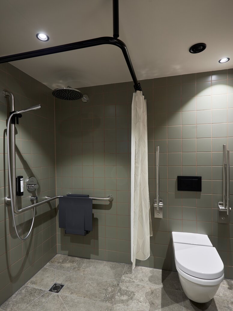 "Our goal is design that is both aesthetic and standard-compliant, and barrier-free without compromise," emphasises Antonia Wileschek, Product Manager Design at HEWI. In addition, Dreimeta selected the curtain rail with ceiling support from the HEWI classic design series 477/801 for the Cocoon hotel. The shower handrail with shower head rail comes from the 805 series, which, like the 477/801 series, is based on the round tubular design. "With HEWI products, the barrier-free rooms and bathrooms can be designed just as aesthetically and homely as the other areas," emphasises interior designer Andrea Kraft-Hammerschall.