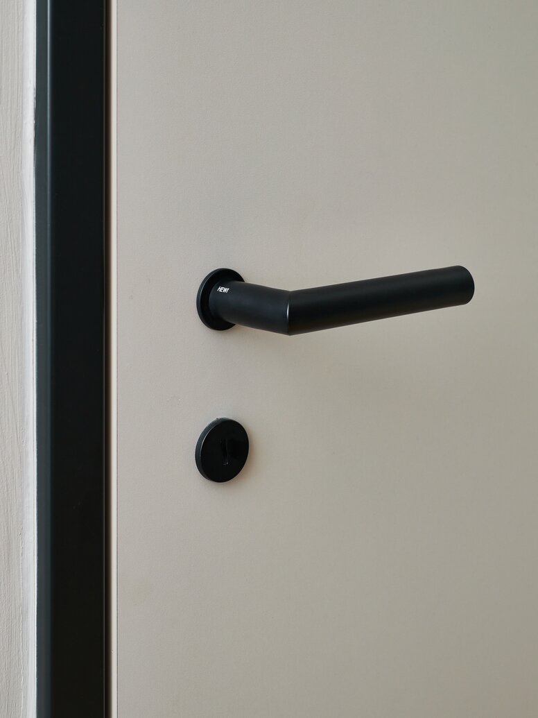 Black accessories such as bed lamps or cloakroom rails complement the interior in the rooms of the Cocoon.  To match, Dreimeta selected the timeless and minimalist lever handle System 162 from HEWI in elegant matt black. "HEWI's solutions are simple and functional and always complement our interior design concepts very well without putting themselves in the foreground," says Andrea Kraft-Hammerschall, interior designer and CEO of the Dreimeta office.