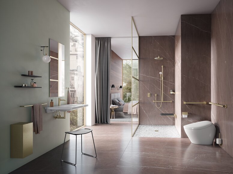 More glamour in the bathroom: Brass, bronze or gold are just some of the new metallic designer surfaces from HEWI that can be used to transform contemporary sanitary rooms into personalised oases of well-being – be it in hotels, in representative public buildings, in elective surgery areas in hospitals or in the bathroom at home. Altogether, the manufacturer is offering five colours in either brushed or glossy finishes for its accessible sanitaryware and accessories, all manufactured in the PVD process. This allows for even more diversity and scope for bathroom planning.