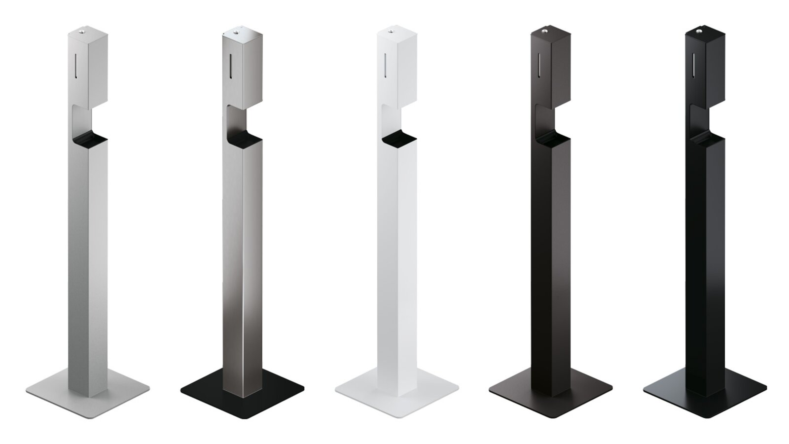 Grâce à leurs différents designs, les distributeurs de produit désinfectant en colonne peuvent être utilisés aussi bien dans la restauration que dans les crèches ou les cabinets médicaux. Idéalement, le système de distributeur dispose déjà d'un revêtement antimicrobien. Ces distributeurs de produit désinfectant mobiles sont thermolaqués et disponibles en noir, en plusieurs nuances de gris, en blanc ainsi qu'en variantes en acier inoxydable.