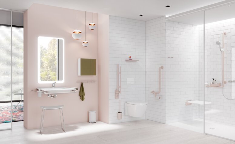 Kolejnym ważnym wsparciem są drążki przy toalecie. W tym przypadku służą one nie tylko jako bezpieczna opcja trzymania, ale także ułatwiają zarówno wstawanie jak i siadanie. Dodatkowąopcję wsparcia w tym miejscu zapewnią uchwyty uchylne. W razie potrzeby można je odchylić od ściany, aby ułatwić na przykład przesiadanie się z wózka i z powrotem na wózek..